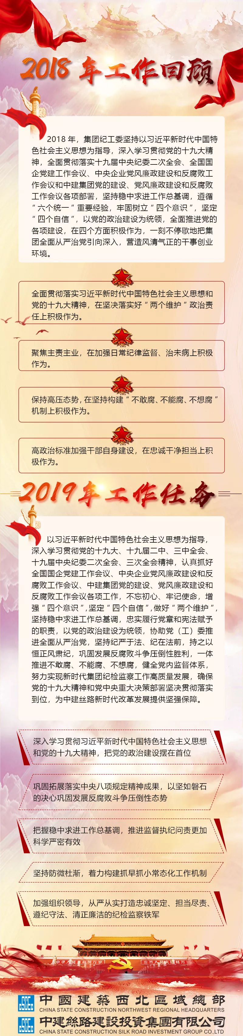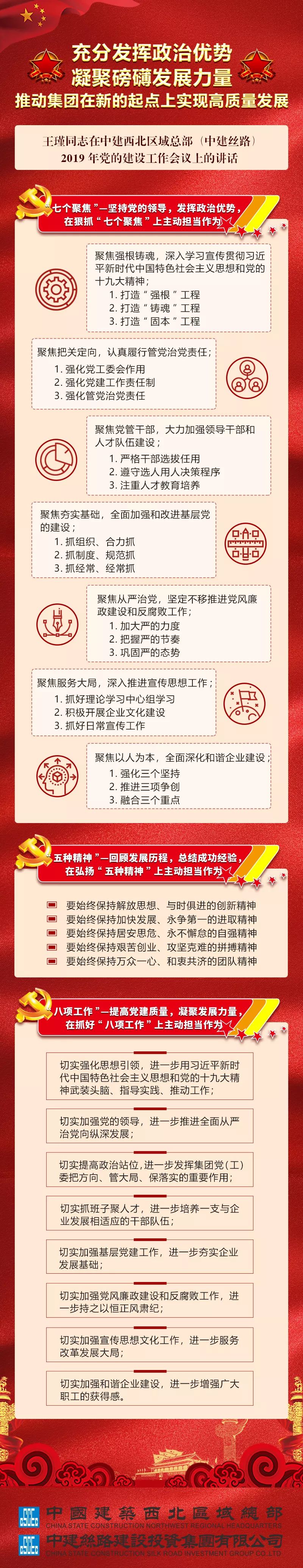 会议以习近平新时代中国特色社会主义思想为指导,学习贯彻党的十九大、十九届二中、三中全会精神,紧紧围绕新时代党的建设总要求,认真落实全国组织工作会议、全国宣传思想工作会议精神,传达了十九届中央纪委三次全会、中央企业党风廉政建设和反腐败工作会议、中建集团2019年党建工作会议、党风廉政建设和反腐败工作会议有关精神,以“七个聚焦”、“五种精神”深入总结了西北区域总部(中建丝路)2018年度党的建设、党风廉政建设和反腐败工作所取得的成绩及经验,明确了2019年集团党工委的“八个切实”党建工作任务,统筹部署了集团党的建设、党风廉政建设和反腐败工作各项任务。