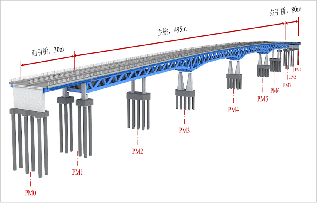 项目桥梁结构设计与建造技术先进,“一大两高三新”特点突出,是国内第三座双层变截面连续钢桁梁桥,主跨跨度120m、联长495m,均为全国同类梁桥之最。