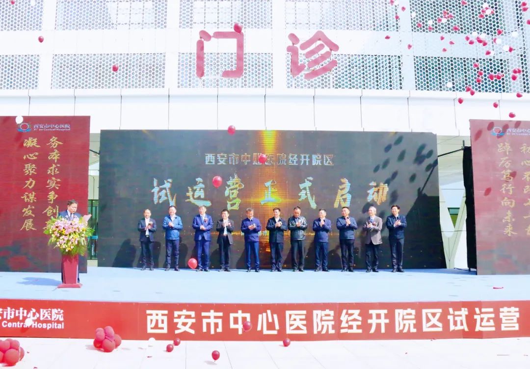 今日上午,西安市中心医院经开院区试运营启动仪式正式举行,陕西省医疗保障局一级巡视员王睿民,陕西省卫健委二级巡视员刁卫平,西安市政府副秘书长张博,经开区管委会党工委副书记、主任贾强,西安市卫健委副主任丁力,经开区管委会党工委副书记张兴华,中建丝路党委副书记、总经理尉家鑫,西安市中心医院党委书记王栋,西安市中心医院院长虎威,西安经发集团有限公司党委书记、董事长彭晓晖,北方发展投资有限公司党委书记、总经理陈广成出席活动仪式。
