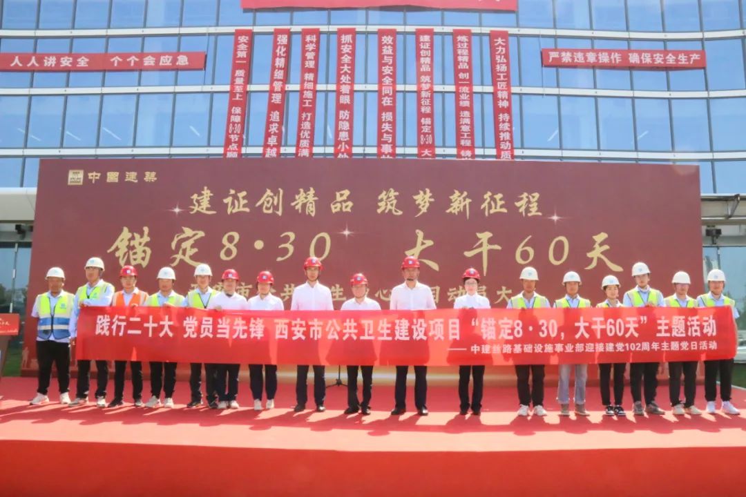 6月30日,中建丝路基础设施事业部党委开展“践行二十大 党员当先锋”主题党日活动,在西安市公共卫生建设项目举办“锚定8·30,大干60天”动员大会,号召全体干部职工攻坚克难、全力冲刺,进一步凝聚干事创业力量,为顺利完成建设任务而不懈奋斗。